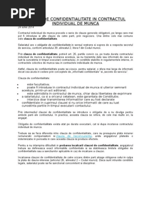 Clauza de confidentialitate se plateste. Buna seara sunt. As vrea sa stiu daca il pot da afara da in judecata pentru incalcarea clauzei de confidentialitate daca are voie sa faca publice partial sau total informatiile cuprinse in fisa postului sau. Medeea2013 utilizator 21 42 4 aprilie 2013. Pe toata durata existentei contractului individual de munca salariatul se obliga sa nu transmita date sau informatii confidentiale de care a luat cunostinta pe cale directa sau incidentala in timpul executarii contractului individual de.