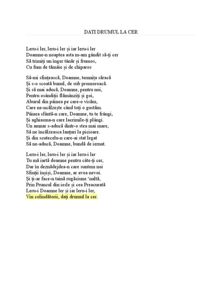 Dați drumul la cer. și ți ar face n taină rugăciune naltă prin pruncul din iesle și cea preacurată leru i doamne ler și iar leru i ler vin colindătorii dați drumul la cer. Vin colindătorii dați drumul la cer. Vin colindătorii daţi drumul la cer colind rugă şi poezie la naşterea domnului în comunitate.